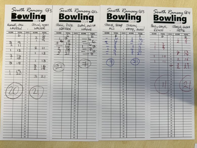 Losing out at the quarter final stage and the closest game of the round were the home team consisting of Lauren Groen, Elaine Moore, and Gill Dixon 20-21 to the Marown trio of Colin Kelly, Walter McCarthy, and Tom Kelly. John Kennish, Dido Kelly, (South Ramsey) and Nathan Cooil (Castletown) eased to a 21-7 win over the Breagle Glen trio of Wayne Roberts, Anita Roberts, and Ewan Cooil in just seven ends.