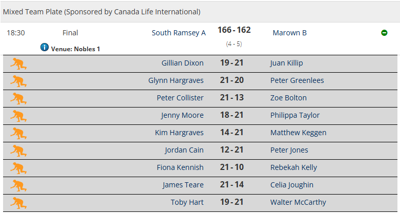 Gill Dixon had a tussle with Juan Killip, only to lose out 19-21, Glynn Hargraves just edged home 21-20 against Peter Greenlees, while Peter Collister ran out from 13-13 with Zoe Pearson to seal a 21-13 win to leave South Ramsey seven chalks ahead after three games (61-54).